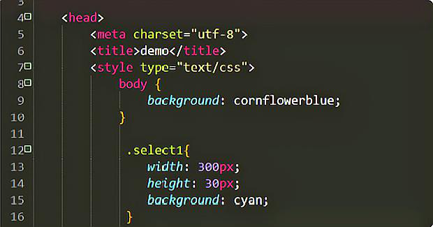 2、然后在顶部的head标记中设置样式表。首先,设置第一个选择标记的宽度。在这里,将select1的样式标签的宽度设置为300px,这是一个精确的值,并设置高度和背景色,以便查看下一步的效果: