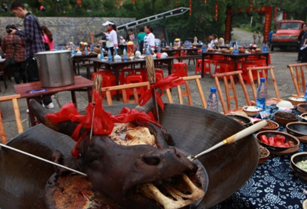 来源:网络收集 点击: 时间:2024-07-27将整只牛头蒸熟后连大铁锅一起端上席,配以泡红辣椒、酸肉、蒿子粑、腊肉,客人们用刀子切割牛头上的牛肉食用,大快朵颐,喝竹筒米酒,体验土司时期土兵出征前满怀豪情准备英勇杀敌的感觉。牛头上每个部位的肉质对于火候的要求都不同,比如在受热相同的情况下,牛脸和牛眼的熟嫩程度就不一样。