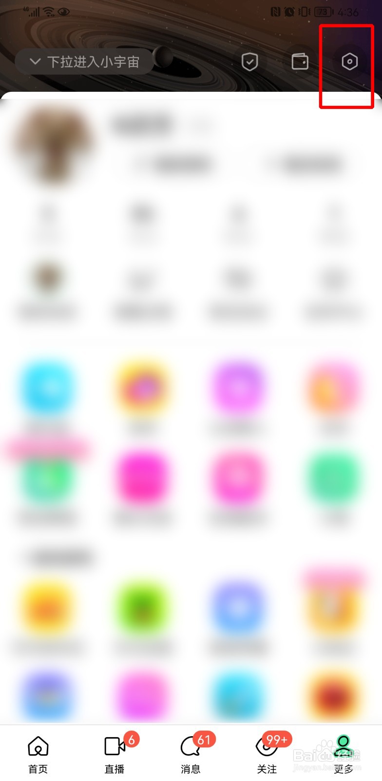 进入陌陌主界面,点击下方菜单栏的更多,点击更多页面右上角的设置图标。