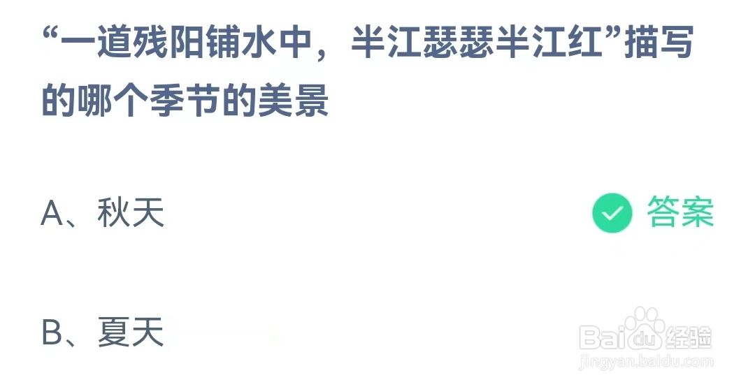 蚂蚁庄园9月27日问题,“一道残阳铺水中,半江瑟瑟半江红”描写的哪个季节的美景?