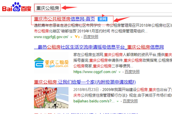 一、打开百度搜索,在搜索栏输入“重庆公租房”,搜索后找到重庆市公共租赁房信息网官网并点击进入。