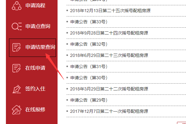 二、进入重庆市公共租赁房信息网官网后,找到“申请结果查询”一项,点击进入。
