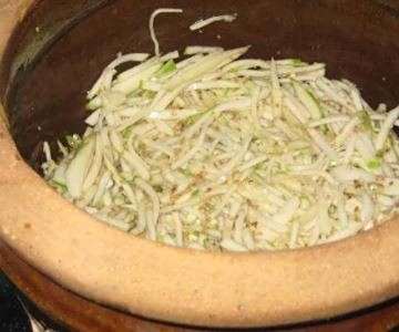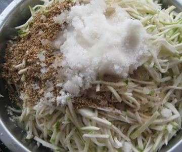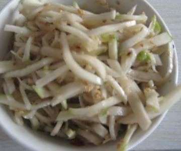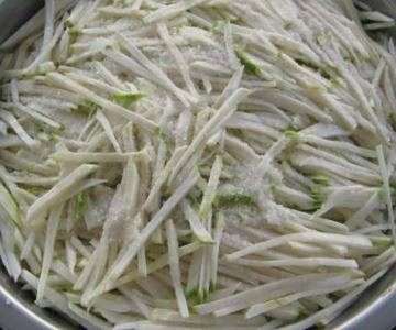1、把芥菜疙瘩切成细丝状,撒上盐。