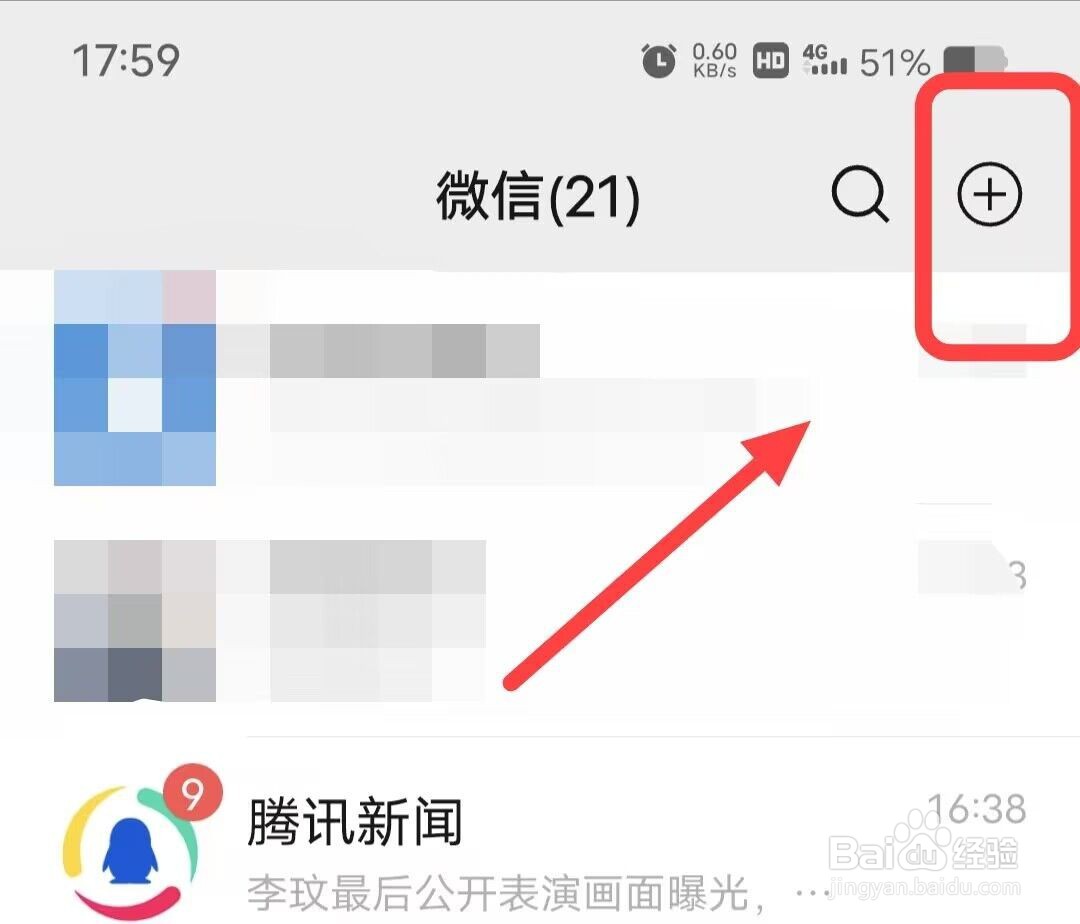 第一步,进入到微信后,点击右上角带圆圈的加号。