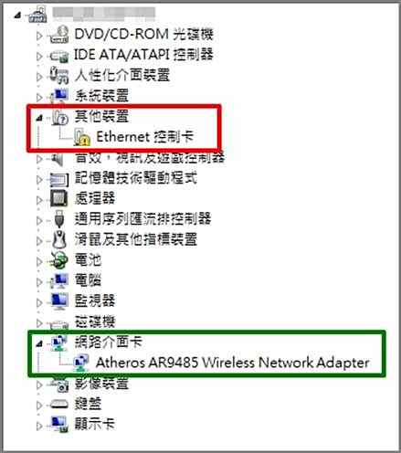 下图绿框是正常的网络卡,红框出现惊叹号则是异常的网络卡