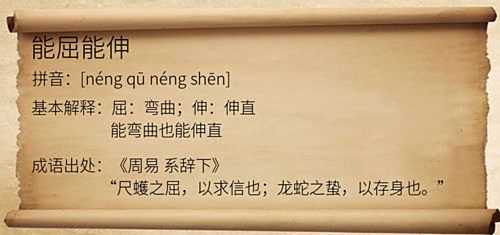能屈能伸,汉语成语,拼音是néng qū néng shēn,意思是能弯曲也能伸直。指人能适应各种境遇,在失意时能忍耐,在得志时能施展抱负。出自《易·系辞下》。