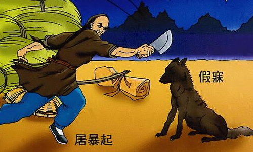 释义:屠户感到害怕,把骨头扔给狼。一只狼得到骨头就停止了,另一只狼仍然跟从。屠户再次扔骨头,较晚得到骨头的狼停住了,之前获得骨头的狼又跟上来了。骨头已经没有了,可是两只狼像原来一样一起追赶屠户。