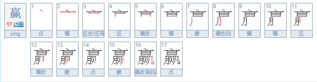 组词:输赢、赢家、赢利、赢得、赢余、赢金、赢勾、丰赢、赢惫、赢啬。