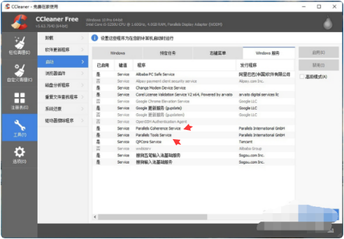 3、点击Ccleaner的工具>启动Windows服务,将Parallels Coherence Service,和Parallels Tools Service这两个功能启用,就可以解决了,完成图如下。这样,更新后parallels desktop虚拟机就可以启动了。