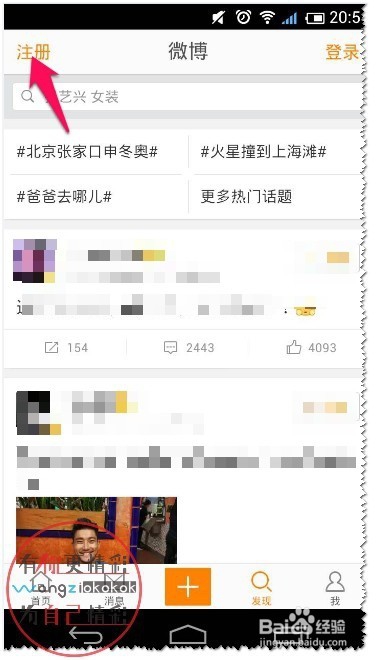 首先安装微博,并打开点击左上角的注册。