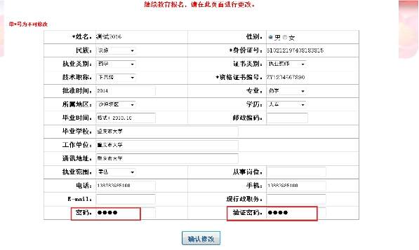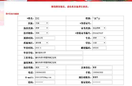 8、管理员审核通过后,学员再进入当初填写资料的环节会出现下图,可以修改已经填报的个人信息和修改自己的密码(默认密码1111),该密码即学员登陆网上学习的密码: