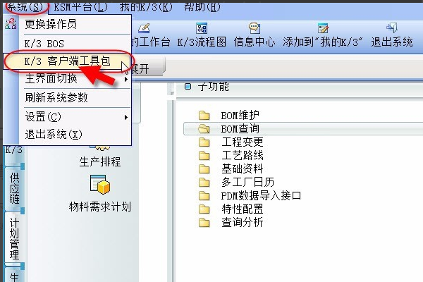 1、首先在系统内点击“系统”菜单,从弹出的快捷菜单中点击“K3 客户端工具包”按钮。