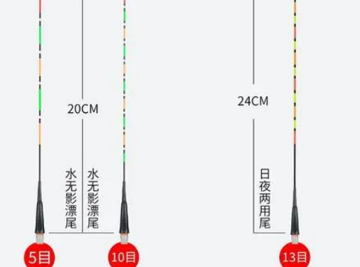 中空鱼漂的自重小,浮力大,反应灵敏,实心鱼漂的稳定性好,但不太灵敏。根据鱼漂形状的不同,还可以分为卧漂和立漂。卧漂就是常说的七星漂,钓鱼时数粒浮子散落在水面上,灵敏度高,扬竿时震动小,但不适宜风浪大时垂钓。立漂就是垂立在水中的鱼漂,常见的有棒形,锥形,圆形,陀螺形等等。