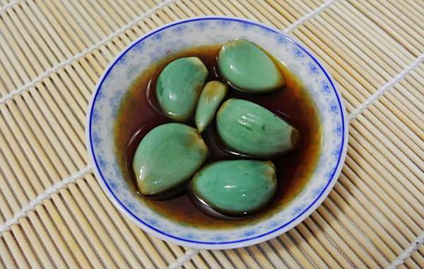 做法也是极其简单,将剥了皮的蒜瓣儿放到一个可以密封的罐子、瓶子之类的容器里面,然后倒入醋,封上口放到一个冷的地方。慢慢地,泡在醋中的蒜就会变绿,最后会变得通体碧绿的,如同翡翠碧玉。中国北方一到腊月初八,过年的气氛一天赛过一天,华北大部分地区在腊月初八这天有用醋泡蒜的习俗,叫腊八蒜。