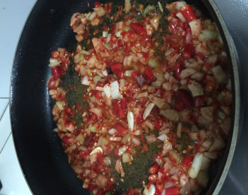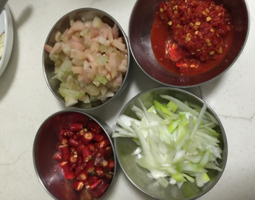 3、泡姜切颗粒一碗、泡椒剁碎准备半碗(也可直接用豆瓣酱)、大葱半碗、不怕辣的再准备朝天椒半碗。