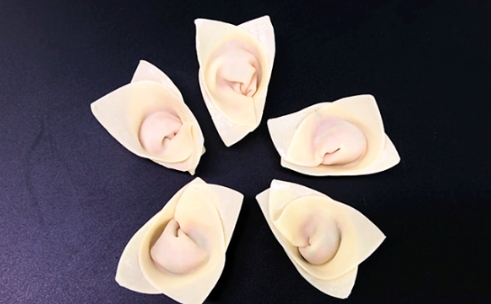 第三种,肉馅放中间,把最下角折上去到中间的肉馅上,再以肉馅为中间再折叠上去,然后捏紧肉馅周围的面片。然后把左右两个角弯曲到一起,捏紧就可以了。这种包法看着很像一个元宝。