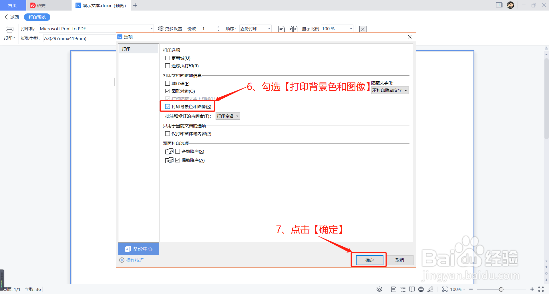 然后在弹出的选项中勾选【打印背景色和图像】, 最后点击【确定】即可