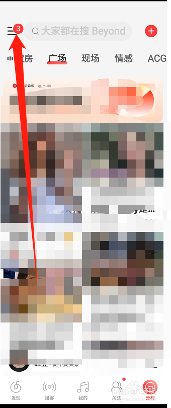 第一步,打开手机上的网易云音乐,然后点击左上角的三条杠图标。