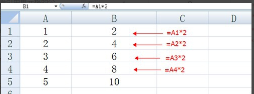 例如:我们在单元格A1-A5中输入数值“1,2,3...,5”,然后在单元格B1中输入式“=A1*2”,最后把B1单元格中的公式分别复制到B2至B5,则会发现B2至B5单元格中的结果均等于对左侧单元格的数值乘以2。