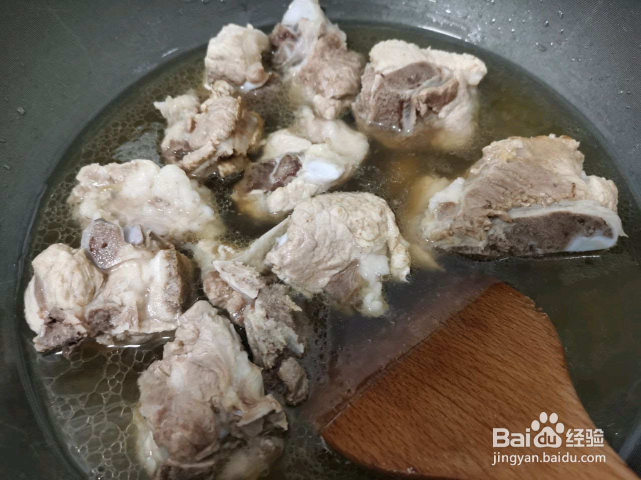 大骨头分段洗净,冷水下锅,加入去腥三件套:生姜、大葱和料酒(我忘了买葱哈哈哈,有肯定是刚好)