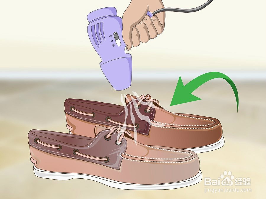 6/8晃动吹风机,慢慢地从鞋子前面吹向后面。必要时,可以转一转鞋子或调整吹风机的角度。你应该会发现蜡几乎瞬间就融入鞋子。吹好一只鞋子后,换另一只重复上述步骤。