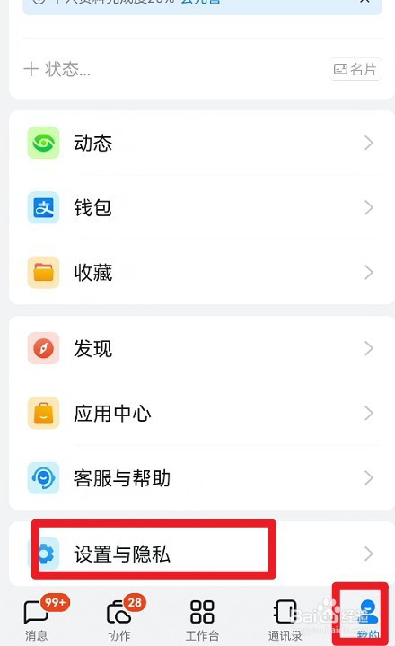 打开软件找到并切换到我的功能模块,点击下方的设置与隐私功能