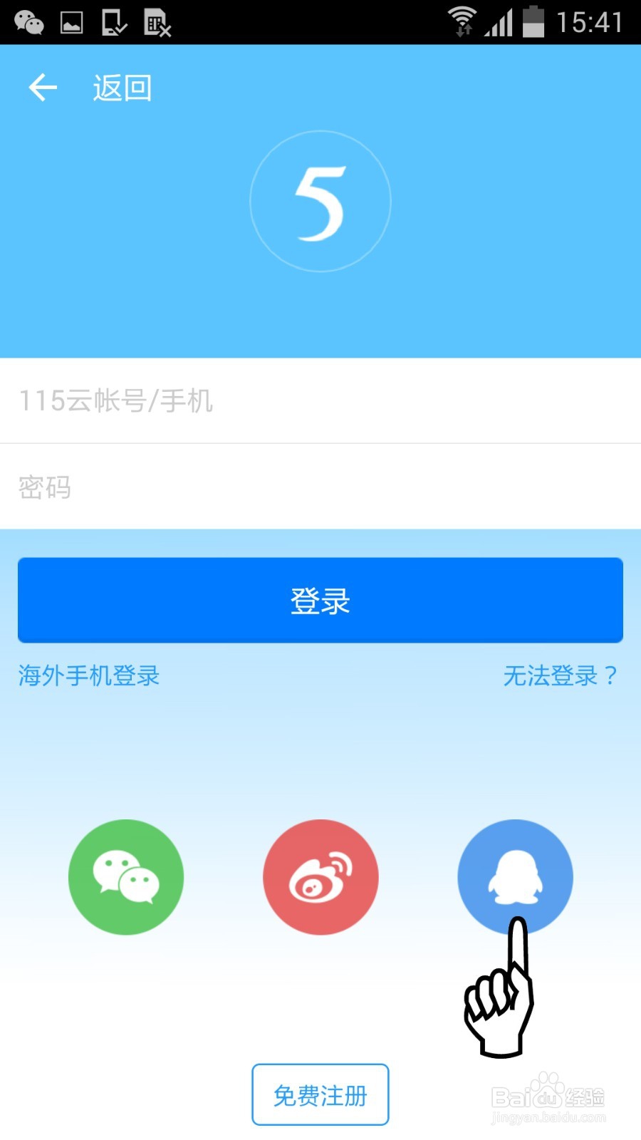 115网盘手机注册方法,首先下载115手机客户端,安装好以后打开,点击QQ号登陆。