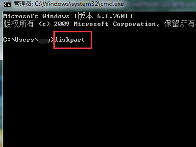 3、在cmd程序中输入命令“diskpart”,进入到磁盘管理的命令中,输入完成后按下回车键确定。