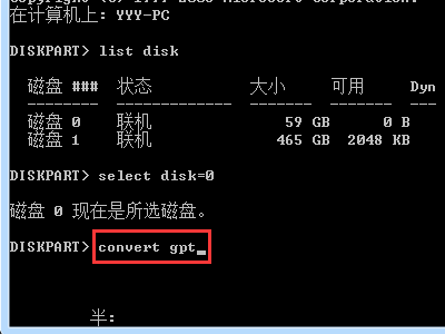6、输入命令“convert gpt”就能将选中磁盘进行转换成gpt。