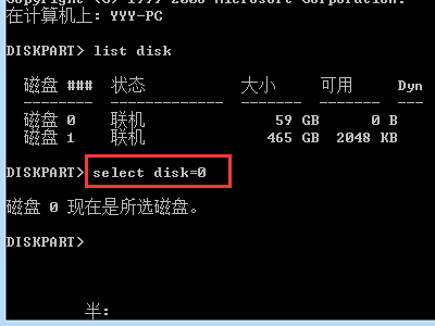 5、输入命令“select disk=0”,选择列表中的磁盘0,如是修改磁盘1则输入“select disk=1”。