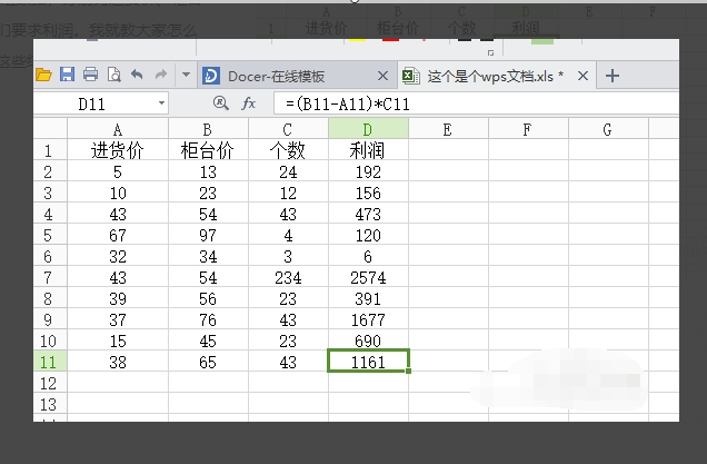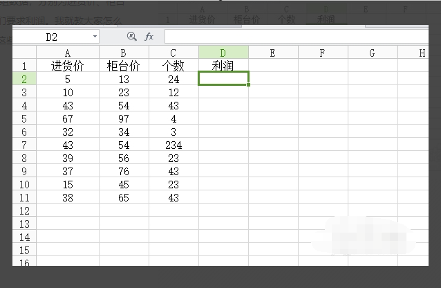1、打开wps2016表格,excel表中有一组数据,分别为进货价、柜台价、个数,我们要求利润。