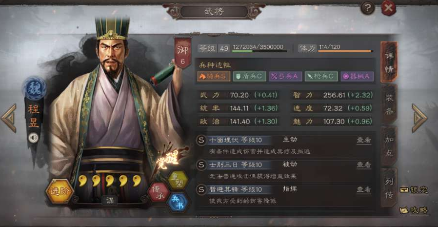 1)程昱主将战法可以带士别三日和太平道法,加点方面建议全智力。