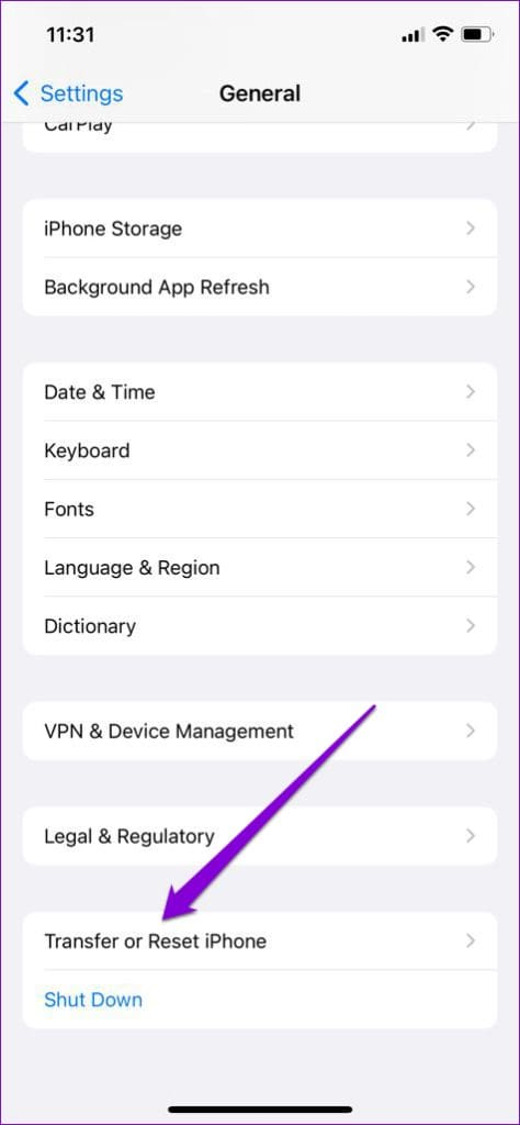 2、向下滚动到页面底部,然后选择“转移或重置iPhone”。
