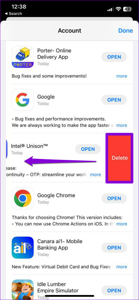 2、向下滚动以找到你想要删除的应用程序。在应用程序上向左滑动以显示“删除”选项并点击它。然后,选择“删除”进行确认。