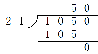 先看被除数的前两位,10小于21不够除,再看被除数的前三位105除以21等于5,商5写在十位上。0除以21等于0,商的个位写0占位。