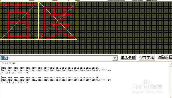 6/6在敲进文字之后,我们可以看到在软件的上方区域显示出相应文字的点阵效果图,接下来点击“生成字模”按钮。这时,我们就可以看到文字被转化为计算机可以识别的十六进制的字模数据了。