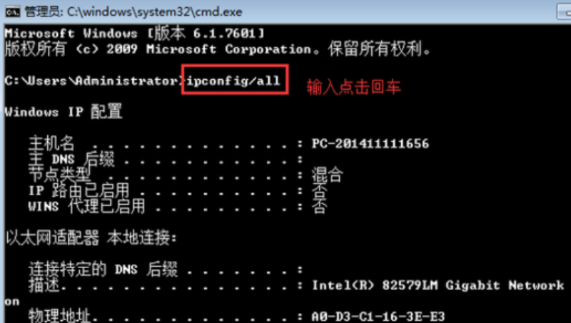 5、按下回车键后就会出现“命令提示符”对话框,点击键盘输入“ipconfig/all”并点击回车,可以查看是否获取到了ip地址。如果获取不到ip地址的话,可以把网卡禁用然后启用一下看看是否有效;