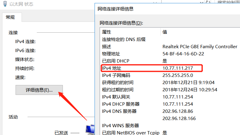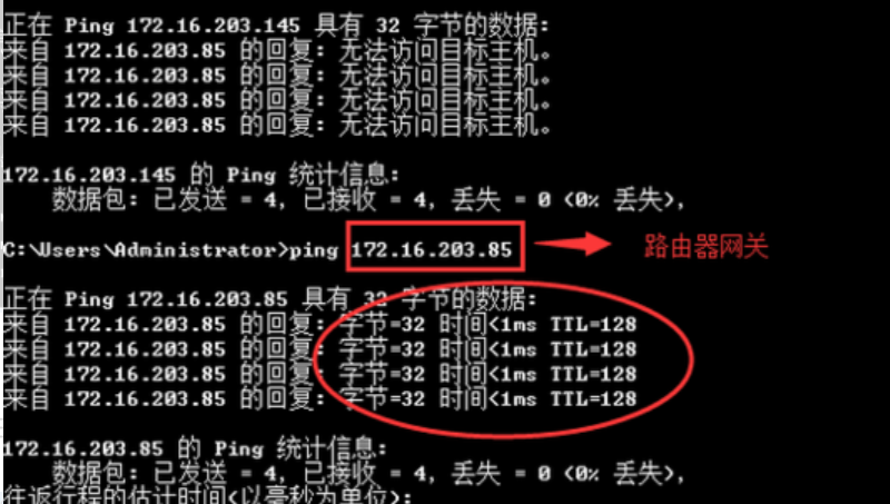 6、如上图电脑是获取到了ip地址,那现在就ping一下路由器的网关(即检查网络是否连通),如果网络不通的话,就需要看下电脑网卡的ip地址是否是从路由器上自动获取的,或者尝试手动配置一个内网的ip;