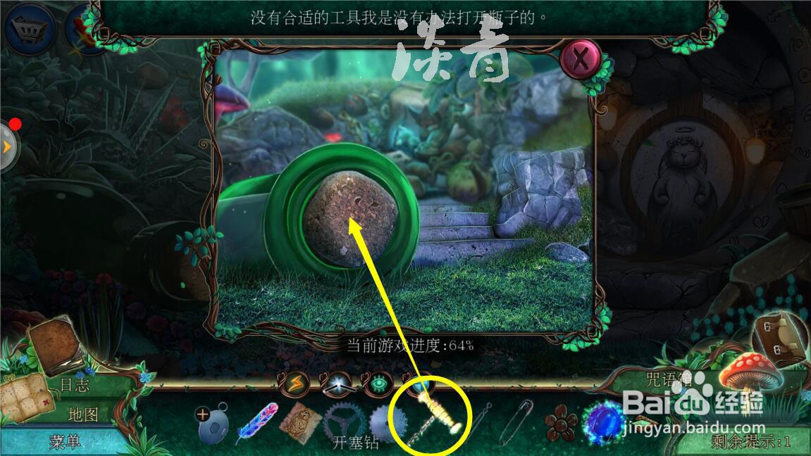 3/7点击左边的瓶子,拿到旁边的【第一个圣坛水晶】;再用【开塞钻】打开左边的瓶塞,接着用【钳子】夹出里面的【橡子和第一个水晶橡子】。