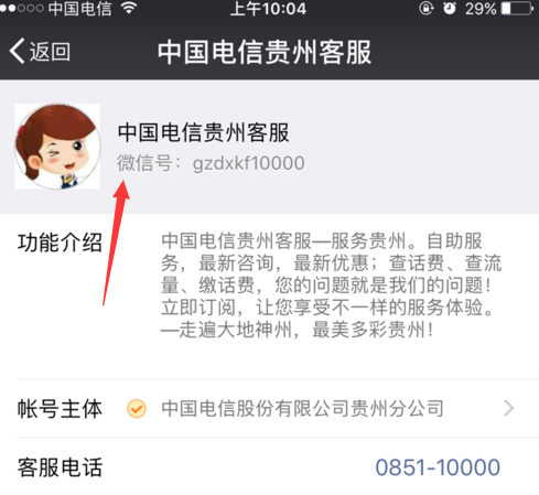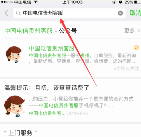 1)、首先打开微信,在微信上搜索当地的中国电信公众号,例如贵州的就填中国电信贵州客服。