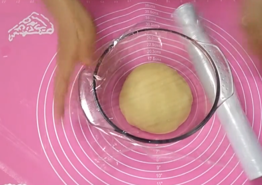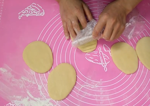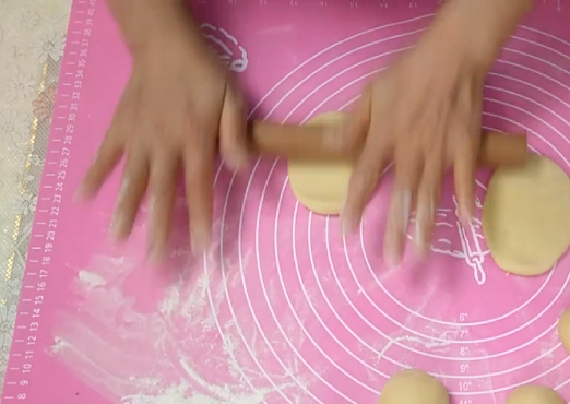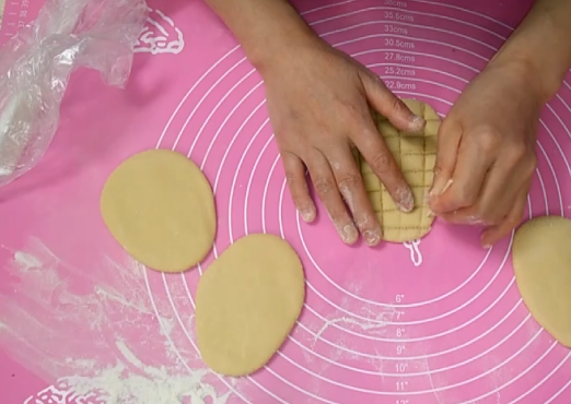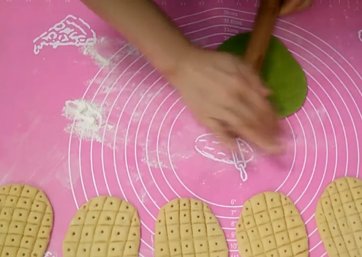 10、然后,再用擀面杖将小剂子擀成饼状,呈菠萝状。
