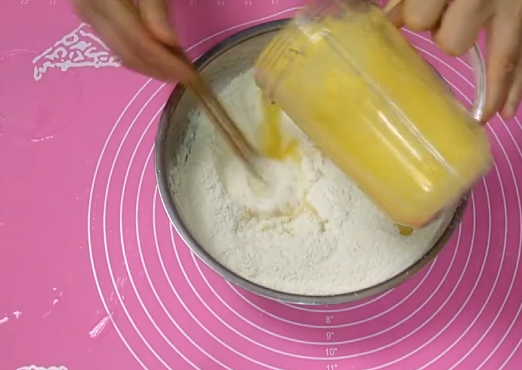 3、接下来就可以用准备好的菠萝汁和面了,可以边加菠萝汁边搅拌。