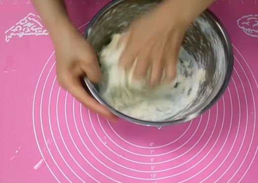 4、用手将容器中的面和菠萝汁搅拌均匀并揉成面团。