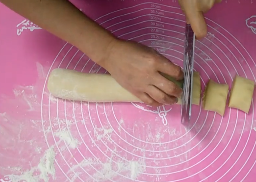 9、等到面团发好以后,将用菠萝汁和成的面切成小剂子。