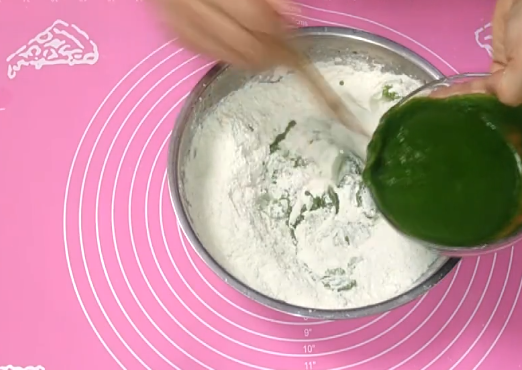6、再重复第1步和第2步的步骤,将菠菜汁倒入面粉中搅拌。