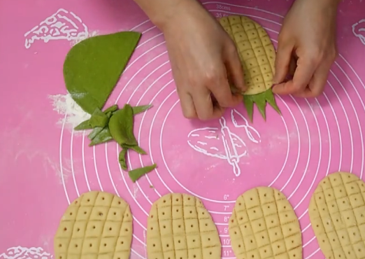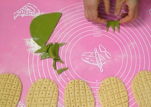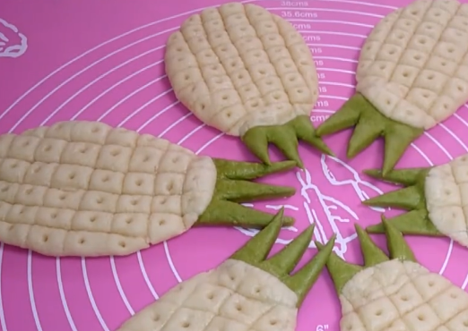 14、用刀将面饼切成,山一样的形状,可以用来作为菠萝的叶子部分。