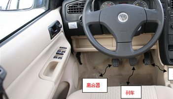 二、通过后视镜观看交通状况,有无来车或障碍物,踩下离合和刹车。开启发动机,立即松开。