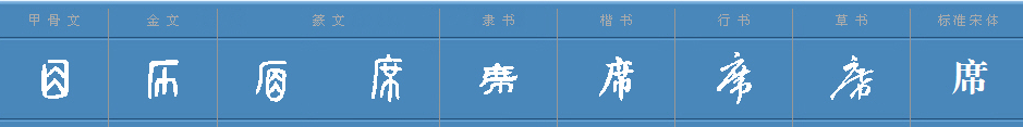 白话版《说文解字》:席,竹垫子。《周礼》上说:“天子、诸侯的席子,有用黑白斧形图案绣边的装饰物。”字形采用“巾”作边旁,采用省略四点底的“庶”作声旁。