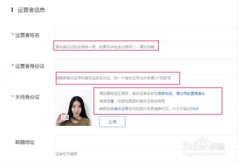 6/7接下来填写运营者信息,注意一个身份证只允许申请一个百家号。另外手持身份证照片一定要按要求上传,否则提交之后审核无法通过。