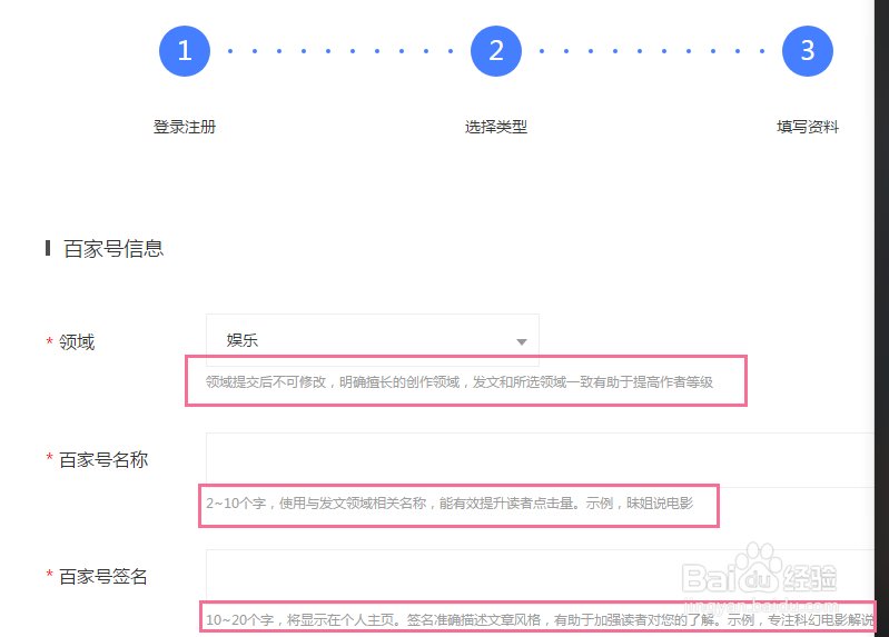 4/7进入填写资料界面。首先选择个人百家号的领域,选择自己擅长的领域,一经选择,后续无法更改。